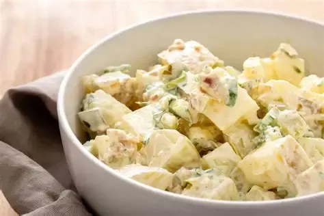 Tender potatoes are fully coated in creamy, tangy dressing, and with every spoonful, you get a satisfying blend of soft, creamy, and crunchy textures with a perfect balance of sweet, savory, and sour notes. It's a side dish that stands on its own, providing a cool, flavorful, and incredibly satisfying experience.